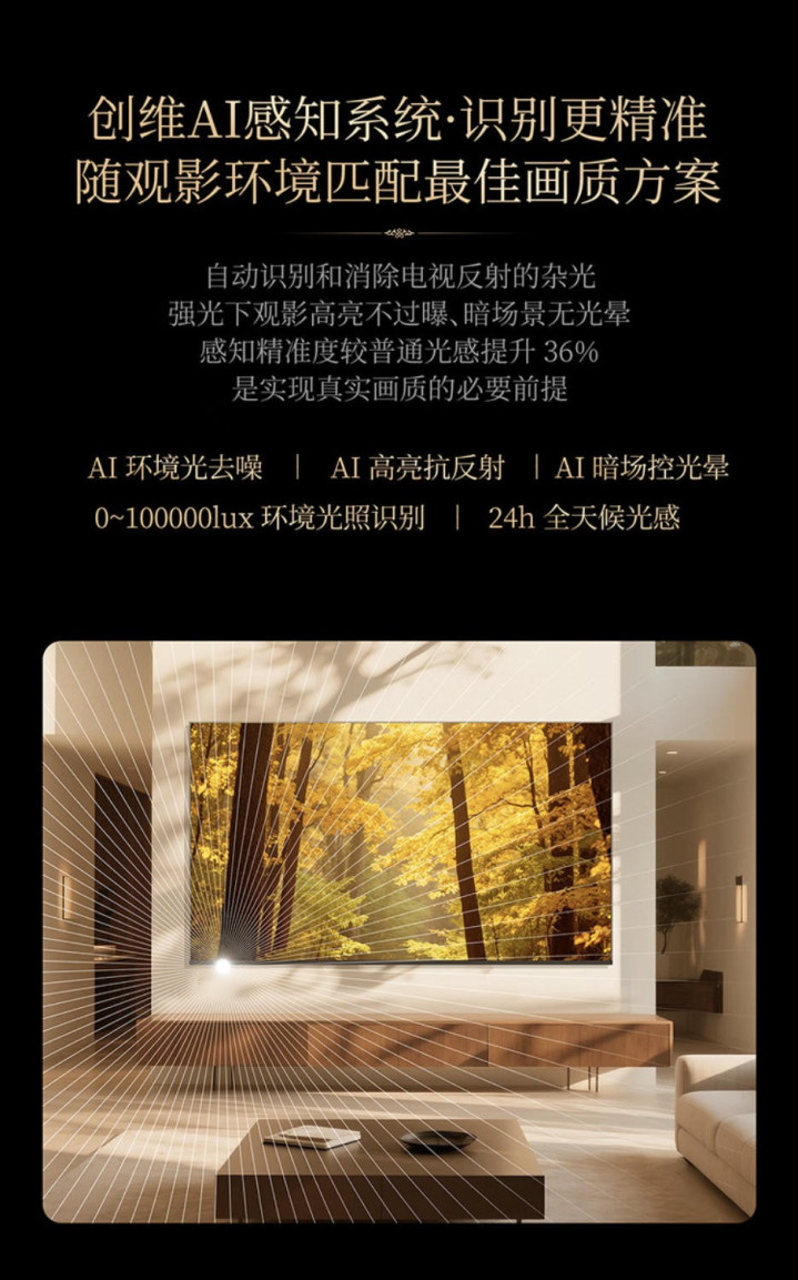 AI环境感知系统更是点睛之笔。高精度光感智芯配合LACE灵晰对比增强、NALE光影均衡和映稳光盾三大算法,实现了"24小时全天候精细光感"。这个系统能够智能识别环境光变化,并实时调整画质参数,再通过一个补偿算法,从而让传感器得到最接近真实环境的环境数据,始终保持稳定,解决了传统电视"关灯过曝、开灯死黑"的痛点。