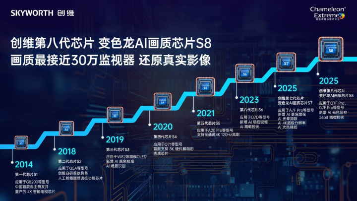 在电视行业,拥有自研画质芯片能力的企业屈指可数。创维从2014年推出中国首款自研4K智能电视芯片,到2018年开创性的变色龙AI画质芯片,再到如今第八代芯片的成熟应用,这条技术路径的背后,是长达37年的画质理解积累。